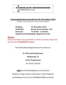 bei der Evangelischen Kirchengemeinde Havelländisches Luch im evangelischen Kirchenkreis Nauen-Rathenow der Evangelischen Kirche Berlin-Brandenburg-schlesische Oberlausitz.