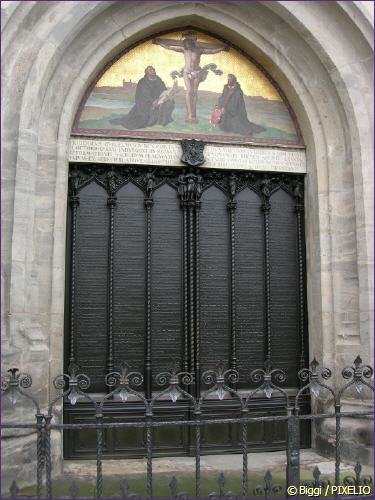 Laut der Überlieferung soll der Mönch und Theologieprofessor Martin Luther am Tag vor Allerheiligen 1517 an die Tür der Schlosskirche zu Wittenberg 95 Thesen in lateinischer Sprache zu Ablass und Buße angeschlagen haben, um eine akademische Disputation herbeizuführen. Damit leitete er die Reformation der Kirche ein. (Quelle: Wikipedia)